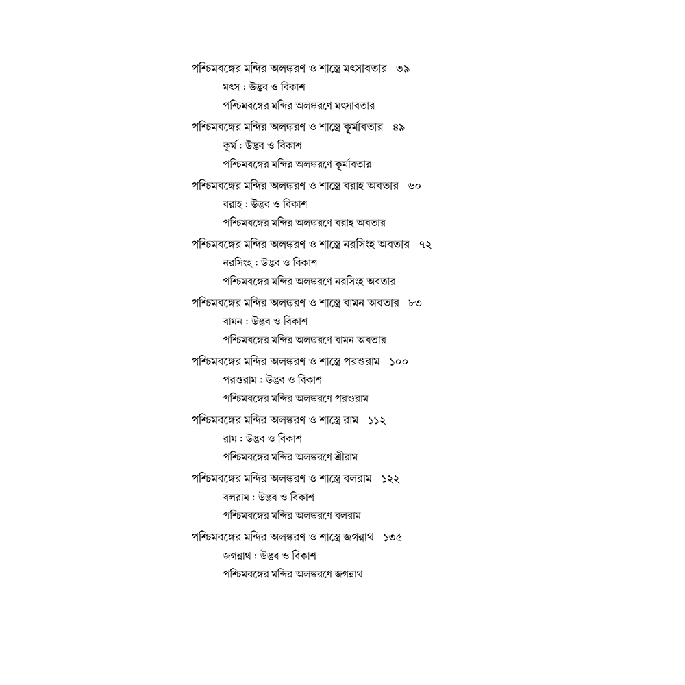 বর্তমান বইটি ‘পশ্চিমবঙ্গের মন্দির অলঙ্করণ’ সিরিজের তৃতীয় বই। পুরাণেই প্রথম ‘অবতার’ কথাটি দেখা যায় এবং ভগবান বিষ্ণুরই সবচেয়ে বেশিবার অবতার রূপে মর্ত্যে আসার কথা বলা হয়েছে, এবং সেই অবতারের সংখ্যা অধিকাংশ ক্ষেত্রেই বলা হয়েছে দশ। বিভিন্ন পুরাণে এই বিষ্ণু-অবতারদের নিয়ে কিছু কিছু ভ্যারিয়েশন থাকলেও দশাবতারের মূল থিমটি একই আছে। মন্দির অলঙ্করণকে একটি স্টেটমেন্ট, একটি এনসাইক্লোপিডিয়া বলা যায়। তৎকালীন হিন্দু সমাজে প্রচলিত ধর্মীয় এবং সেকুলার বহু রীতিনীতি, ঘটনা এবং আইডিয়ার জীবন্ত দলিল এই পশ্চিমবঙ্গের মন্দির অলঙ্করণ। বর্তমান বইটি এই দু’টি কাজই করেছে। এতে একদিকে যেমন সাধারণভাবে অবতার এবং বিশেষভাবে দশাবতার এবং তাদের নিয়ে বিতর্কগুলি নিয়ে বিস্তারিত আলোচনা করা হয়েছে, অন্যদিকে তেমনি লেখকের দেখা পশ্চিমবঙ্গের বিভিন্ন জেলার প্রায় ১৫০টি মন্দিরের অলঙ্করণে দশাবতারকে কেমন দেখানো হয়েছে, তার অ্যানালিটিকাল স্টাডি বা বিশ্লেষণ-মূলক আলোচনা আছে।